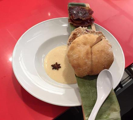 El tercer puesto ha sido para el tinerfeño Eduardo Pelayo, que ha concursado con una curiosa hamburguesa de farinato (un chorizo típico de Salamanca) y plátano canario. En la imagen de la derecha.