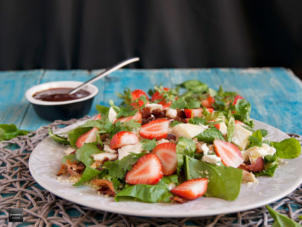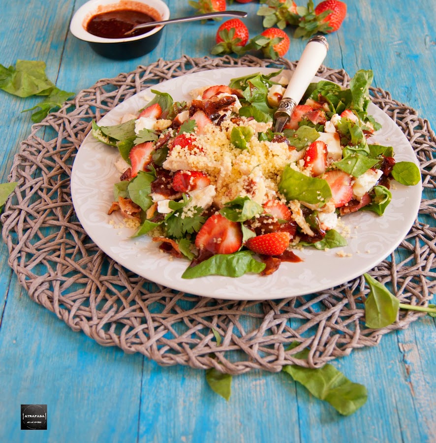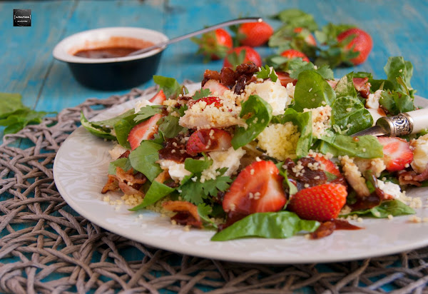 Quizás me he quedado corta con el nombre de esta ensalada, pero es que son tantos los ingredientes que lleva que sería muy largo enumerarlos todos: cous cous, espinacas, fresas, pollo, bacon, queso de cabra, cilantro y vinagreta de fresas. Y es que una ensalada muy parecida lleva tiempo en mi tablero de recetas pendientes de Pinterest. Concretamente una ensalada del blog Closet Cooking, un referente para mi de los blog internaciones, pero que en esta ocasión llevaba quinoa en lugar del cous cous que finalmente le he puesto yo, también llevaba aguacate, y a mi se me olvidó, y la vinagreta era distinta a la mía, la mía de fresas. El resultado ha sido espectacular, una ensalada muy completa con todos estos ingredientes y que además quedan muy bien conjuntados, incluso el cilantro que no me gusta mucho.
