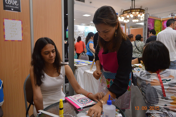 Ya para resumirles un poco, sólo les digo que no me dió tiempo ni de almorzar. Mi esposo que llegó sólo para acompañarme por un rato, le tocó quedarse todo el tiempo a atender a las personas que se acercaban al stand puesto que yo estaba dictando el taller. Incluso tuve que decirle a Meli (La medialuna, mi compañera de stand) que ayudara a una señora con la que me había comprometido para la decoración de unas cajas, porque al final de la tarde tenía 3 personas en simultánea haciendo talleres y una agenda encargada sin hacer, así que el estrés me visitó por un momento.