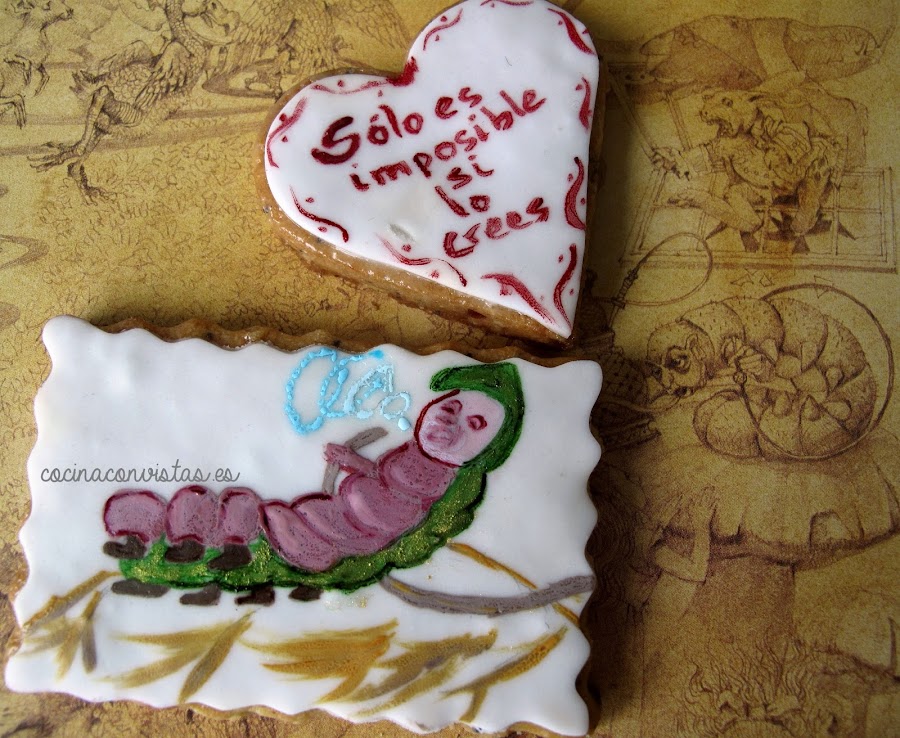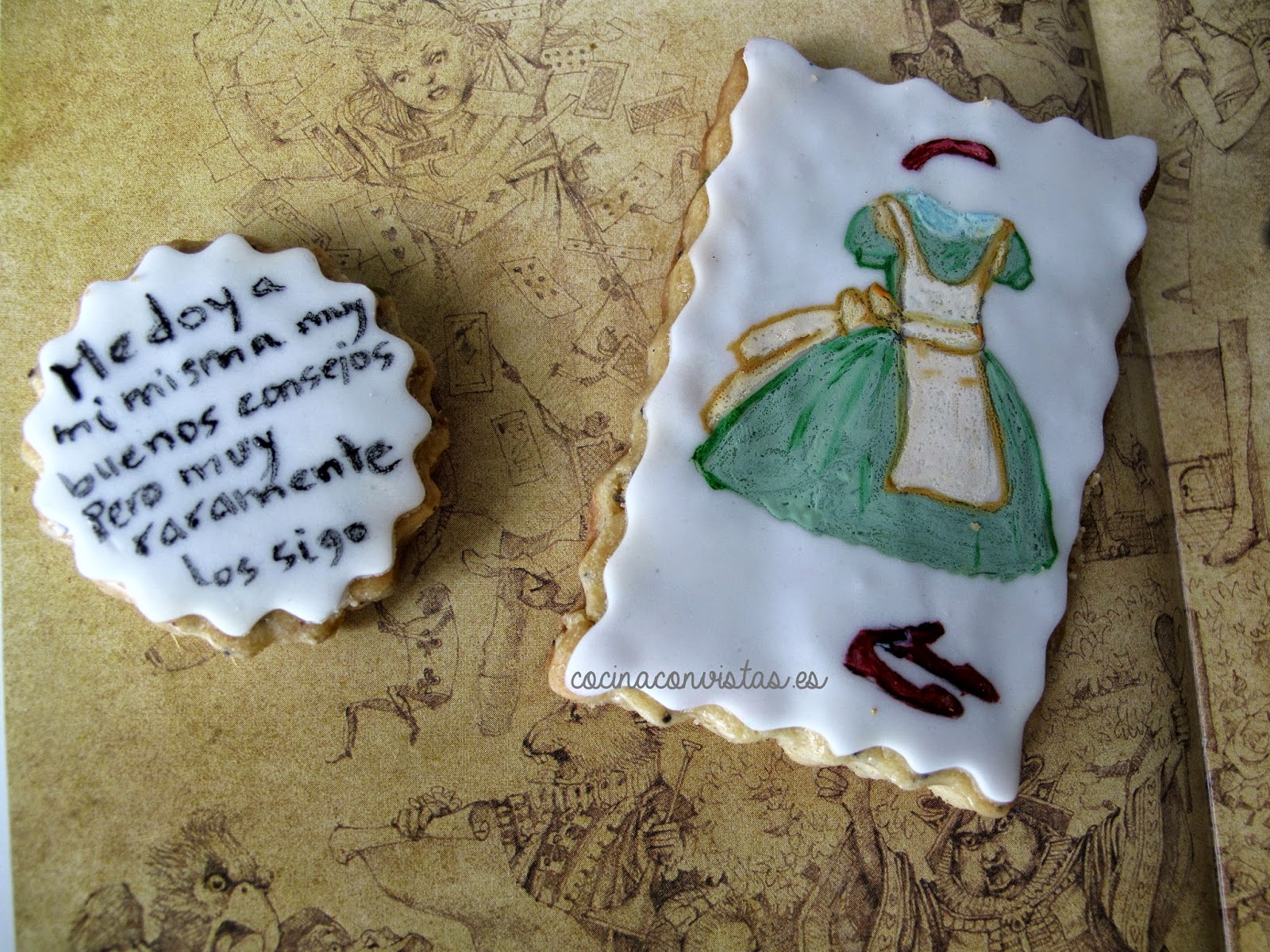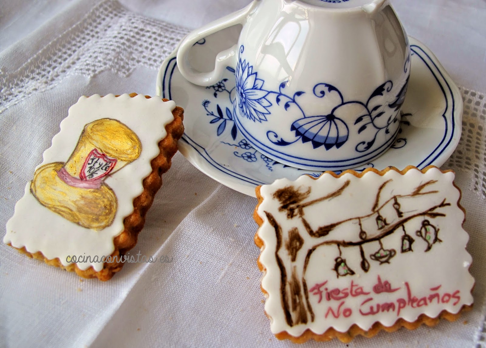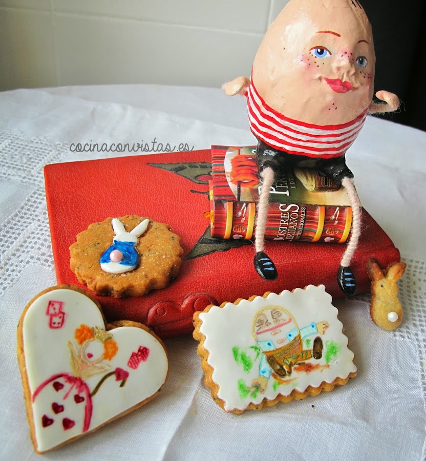 Cocemos unos 10 minutos. Apagamos cuando empiezan a dorarse los bordes de las galletas pero no sacamos las galletas del horno. Esperamos a que estén perfectamente frías para colocar encima el fondant. El fondant lo colocamos entre dos plasticos finos (acetatos) y lo estiramos con el rodillo, lo más fino posible, con los mismos moldes que hemos cortado nuestas galletas cortamos el fondant que lo "pegamos" a la galleta con un poco de leche condensada, mermelada, miel o sirope de maiz (es lo que he utilizado). Esperamos que el fondant esté perfectamente seco antes de empezar a pintar nuestras galletas con las pinturas en gel, como si de pequeños cuadros se tratara. Dejamos secar.