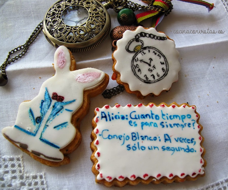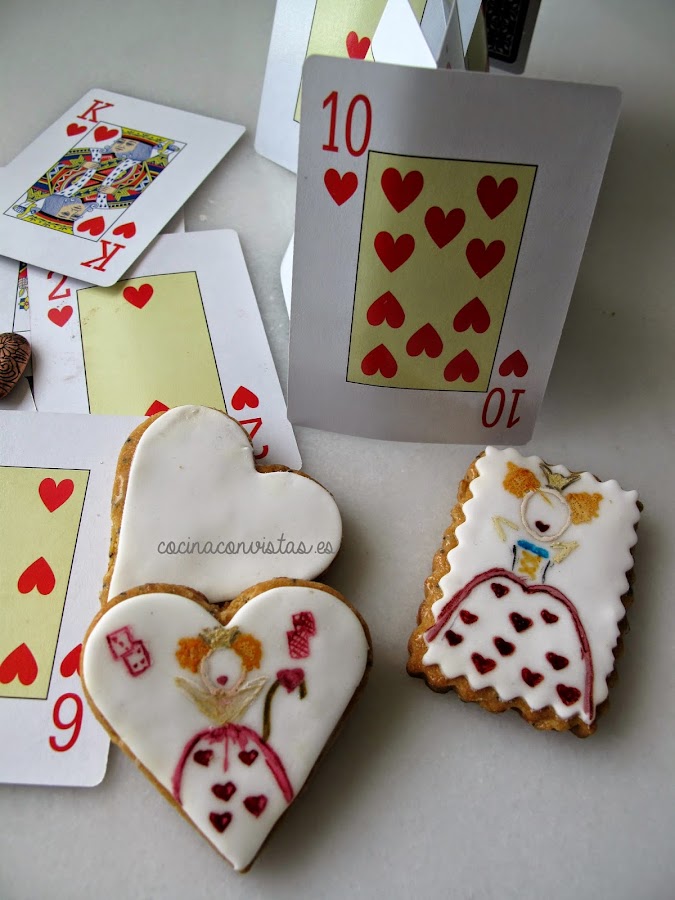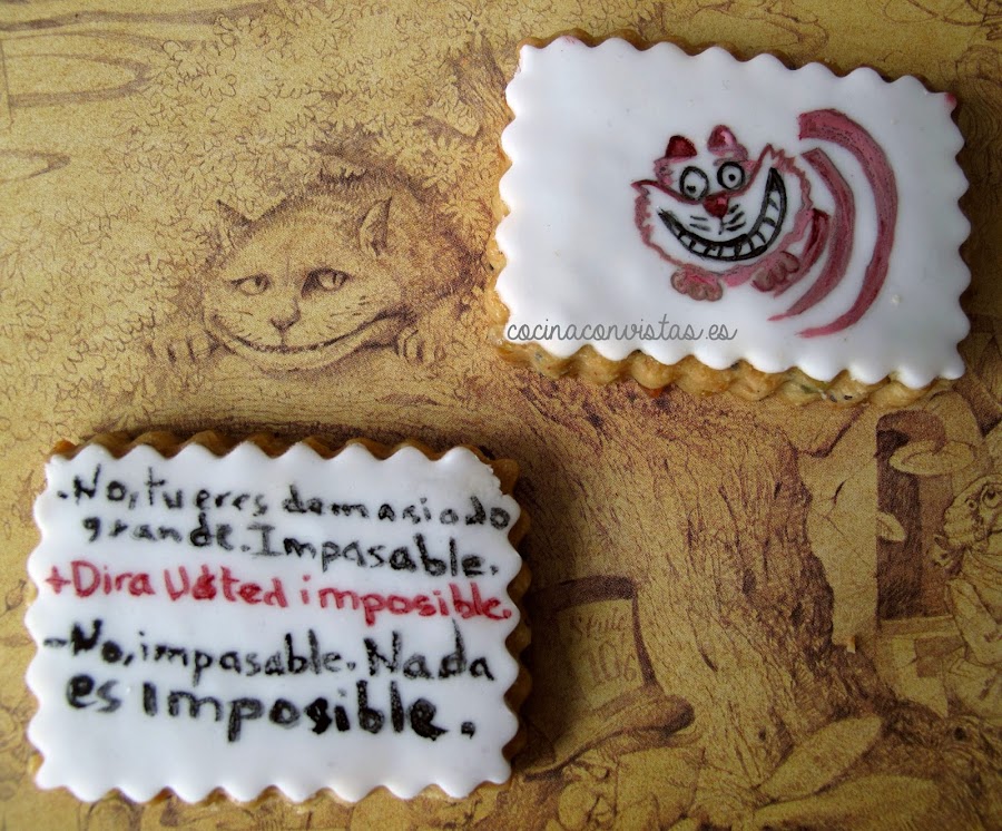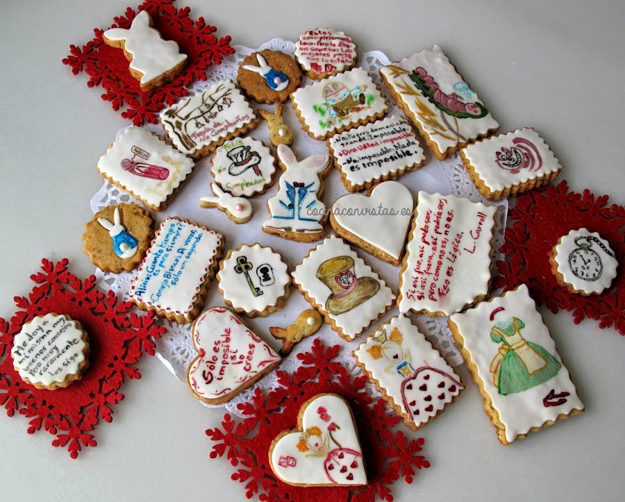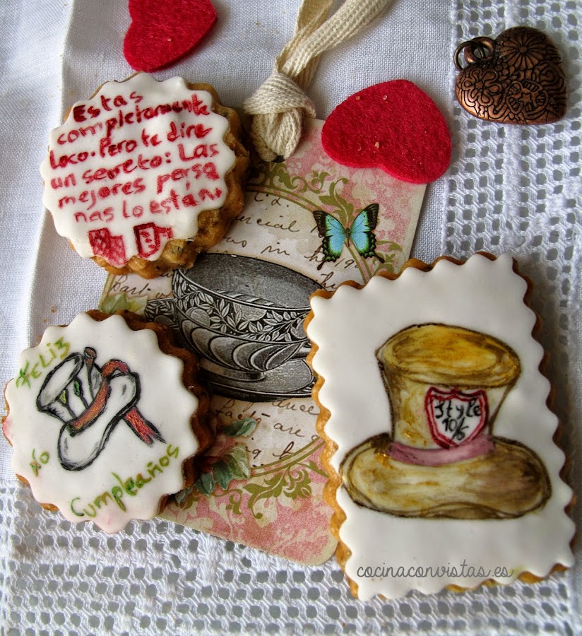 Cocemos unos 10 minutos. Apagamos cuando empiezan a dorarse los bordes de las galletas pero no sacamos las galletas del horno. Esperamos a que estén perfectamente frías para colocar encima el fondant. El fondant lo colocamos entre dos plasticos finos (acetatos) y lo estiramos con el rodillo, lo más fino posible, con los mismos moldes que hemos cortado nuestas galletas cortamos el fondant que lo "pegamos" a la galleta con un poco de leche condensada, mermelada, miel o sirope de maiz (es lo que he utilizado). Esperamos que el fondant esté perfectamente seco antes de empezar a pintar nuestras galletas con las pinturas en gel, como si de pequeños cuadros se tratara. Dejamos secar.