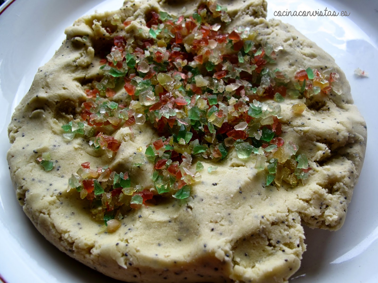 En un bol juntamos la harina tamizada con el azúcar, la sal y la almendra molida. Le añadimos la mantequilla y lo mezclamos primero con los dedos, hasta que nos quede como si fuera arena. Seguimos uniendo la mezcla hasta que esté bien integrada y le añadimos la yema de huevo, remezclamos bien. Incorporamos las semillas y las integramos a la masa. Añadimos la cucharadita de agua, amasamos un poquito e incorporamos las frutas escarchadas muy picaditas. Todo debe quedar integrado. Estiramos la masa y la metemos en el frigorífico unos 30 minutos antes de cortar las galletas para cocerlas.