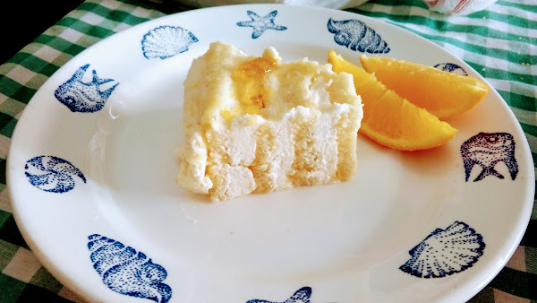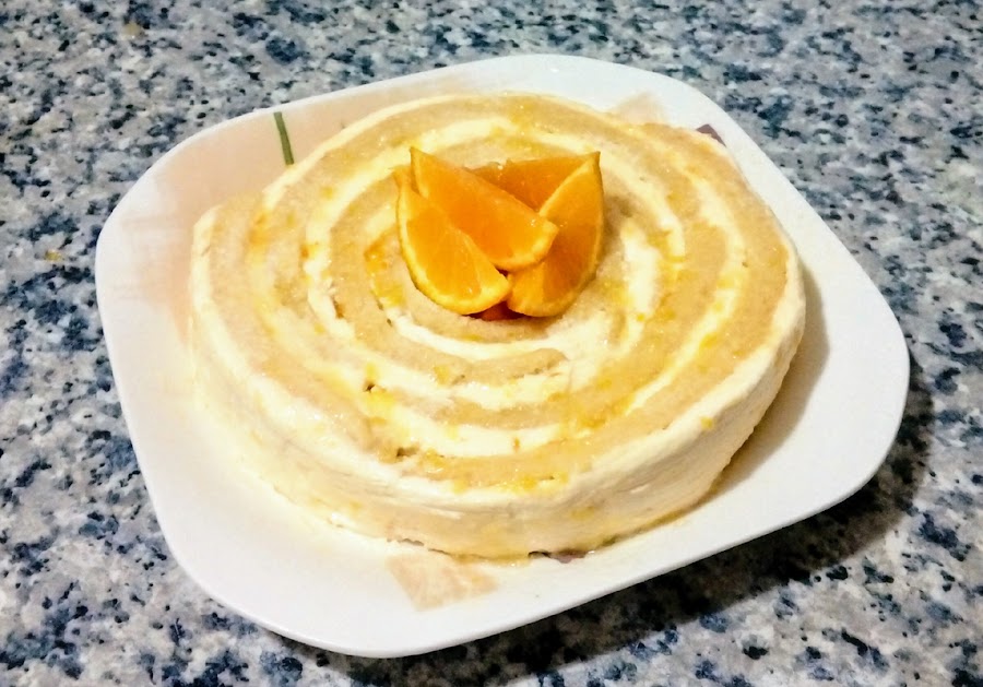 Es un bizcocho de enrollado con crema mouseline y mermelada de naranja.