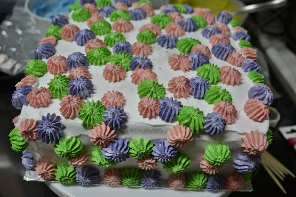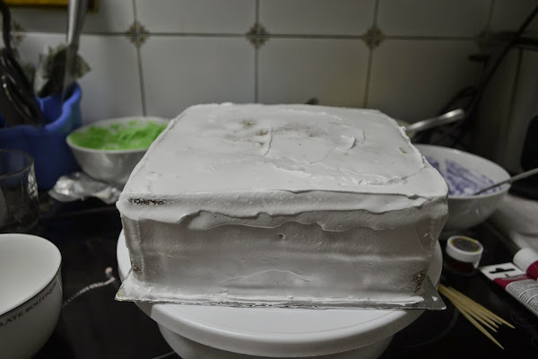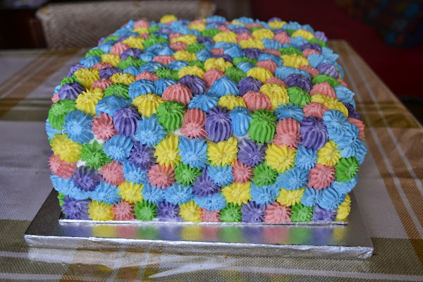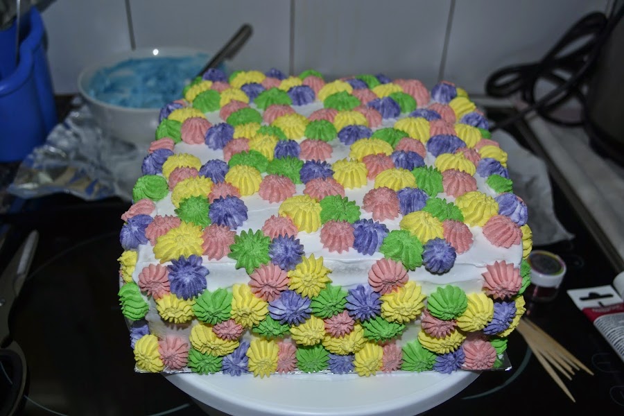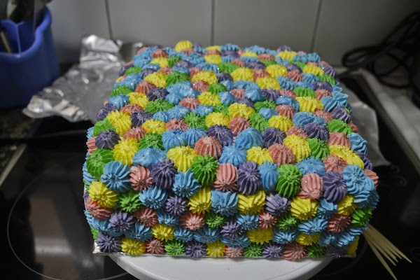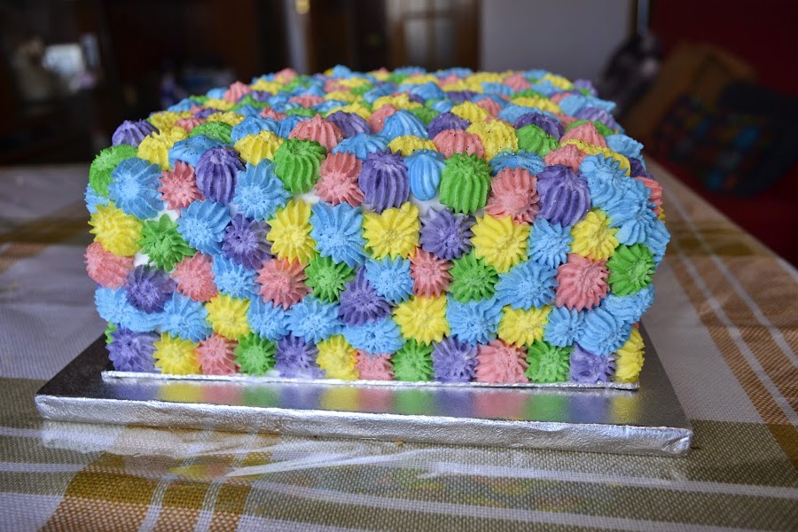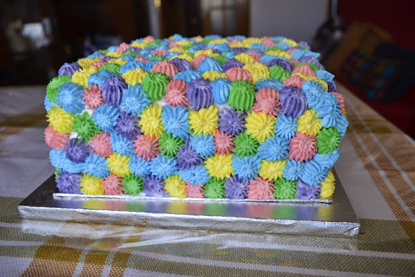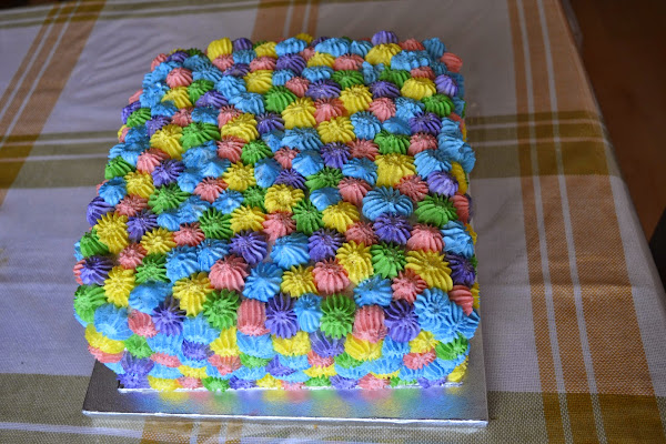 Esta vez les traigo una tarta arco iris, yo le llamo así por la variedad de colores que lleva por fuera, aunque en realidad una tarta arco iris es la que lleva capas de diferentes colores por dentro, algo así como esta que sale en el blog de Ivana Muntan...