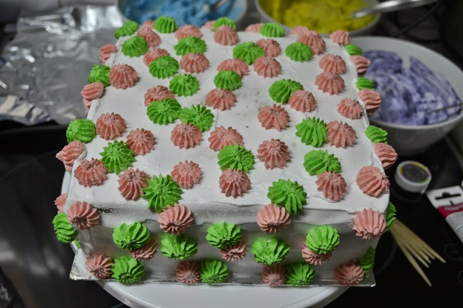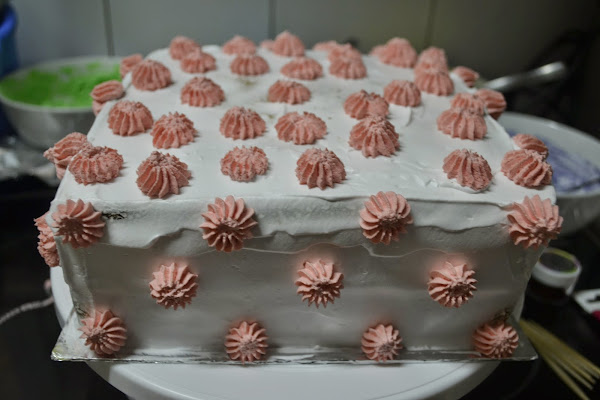 Pon el primer color de nata (crema de leche) en una manga con una boquilla de tu preferencia, en mi caso era la #32 de Wilton. Y he comenzado con el color rosa!