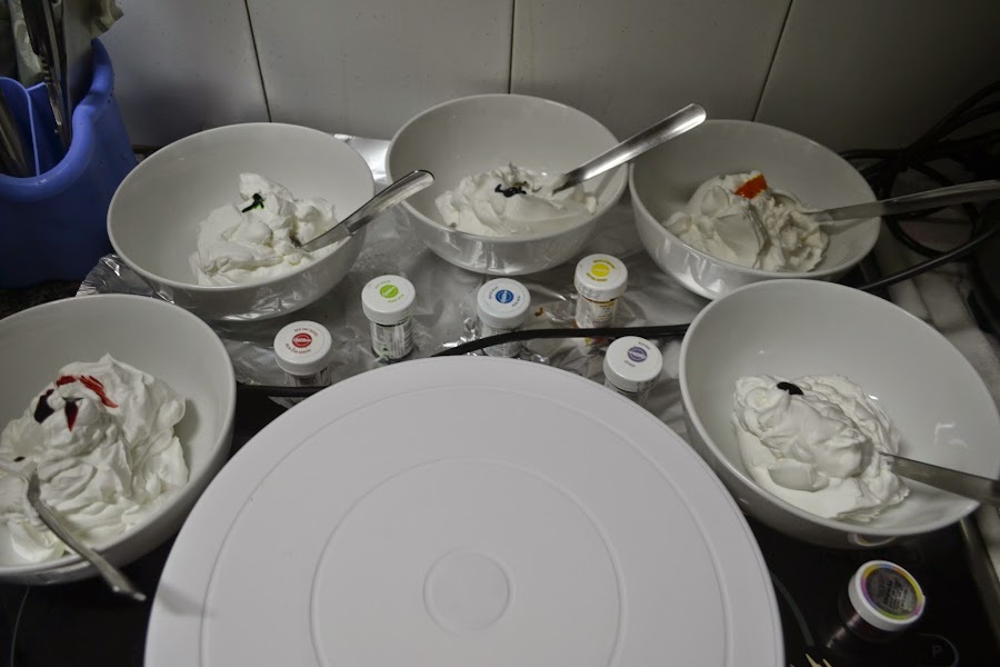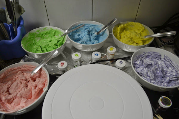Nata (crema de leche) especial para cobertura, tu puedes usar frosting, nata (crema de leche) o merengue! En mi caso después de montarla la dividí en varios recipientes para ponerles a cada uno un color distinto.