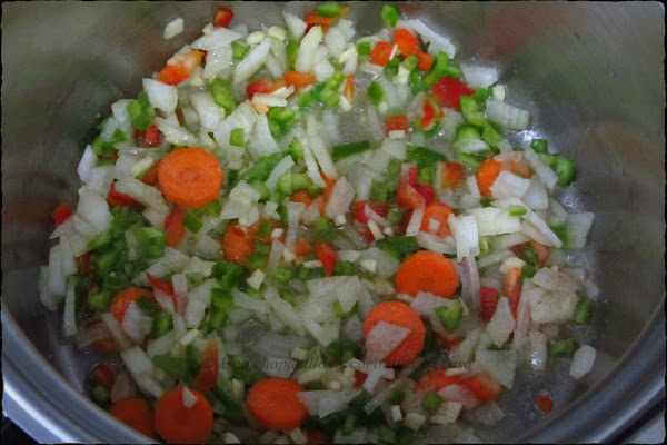 Comenzar troceando las verduras: la cebolla en brunoise, la zanahoria en rodajas, los pimientos picaditos, el ajo también en trozos pequeños y las patatas chascadas.