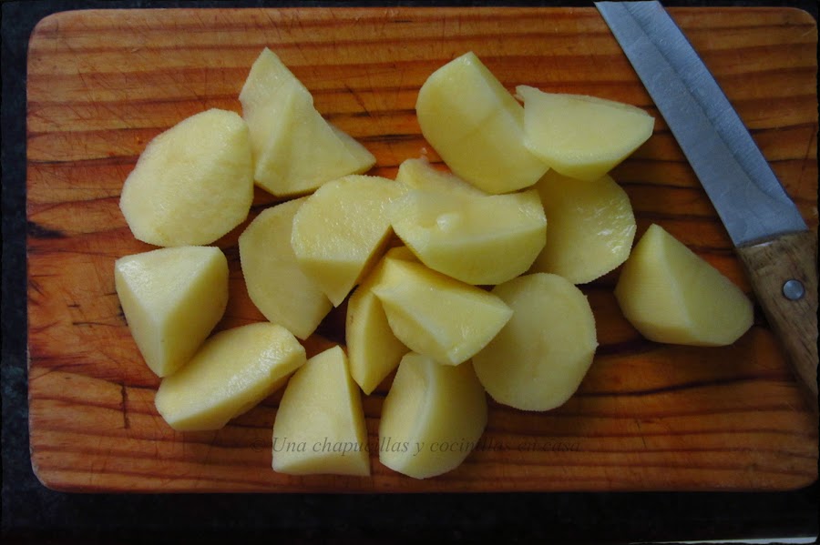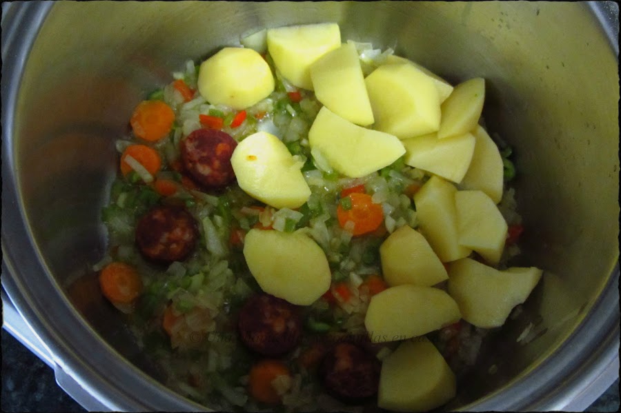Cuando lleva unos minutos y empieza a transparentar un poco la cebolla, agregarle las patatas chascadas y el chorizo.