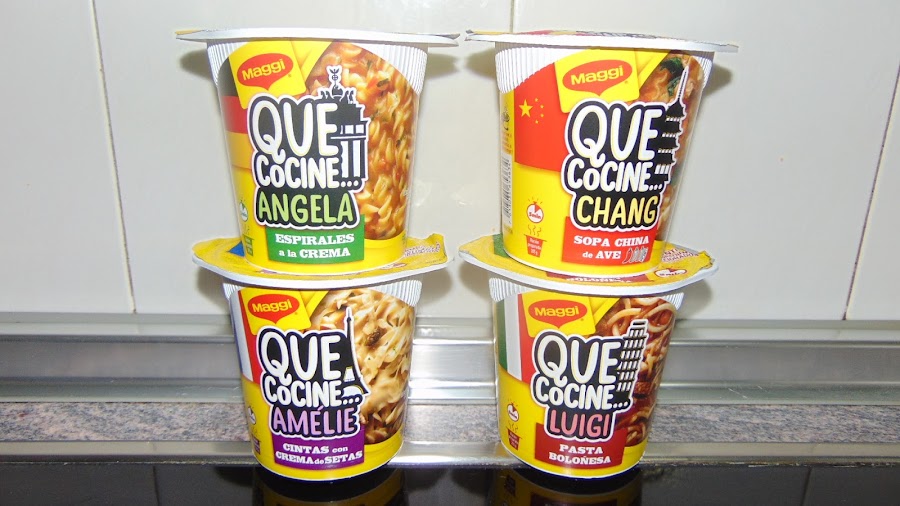 QUE COCINE AMÉLIE Cintas con crema de setas/ QUE COCINE ANGELA Espirales a la crema/ QUE COCINE CHANG Sopa china de ave/ QUE COCINE LUIGI Pasta Boloñesa: Recetas de comidas extranjeras en el típico POT de Maggi. 1,59/unidad