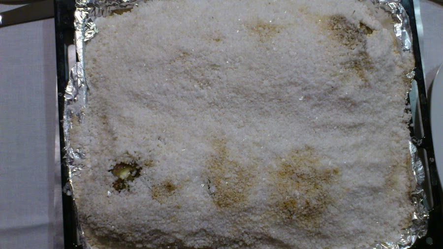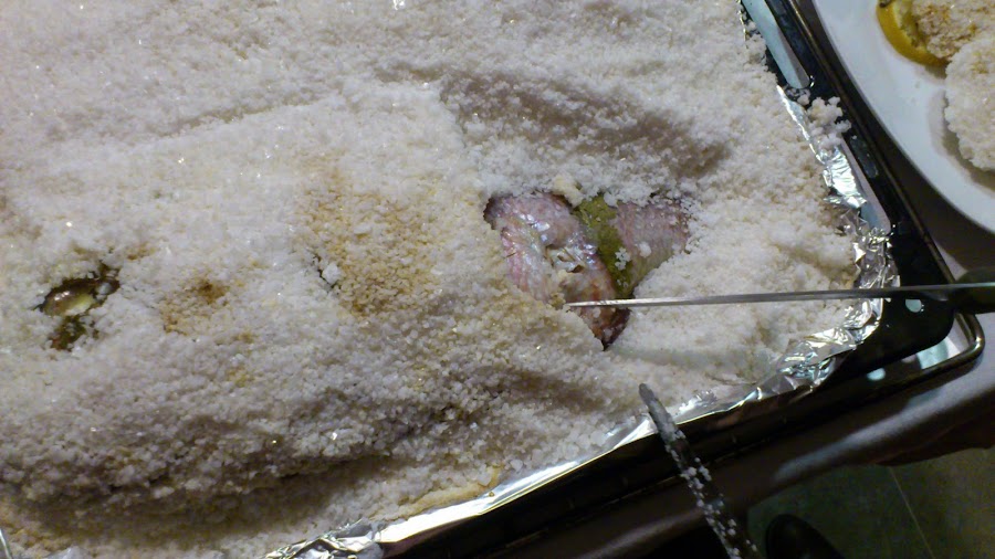 Precalentó el horno, y en una bandeja forrada de albal una capa de 1 cm de sal gorda de pescado, en Mercadona venden una muy buena. Al pescadero hay que decirle que limpie las tripas del pescado. Se colocan las dos piezas y se les pone tres rodajas de limón a cada una y cilantro. Se cubre con 1 cm de sal por completo excepto un ojo por pescado.