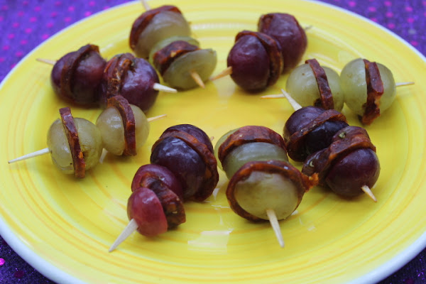 Como tenía unas cuantas uvas rodando por el frigorífico y me quedaban también unas rodajas cortaditas, de un chorizo de herradura picante, se me ocurrió realizar esta sencilla y rica combinación.