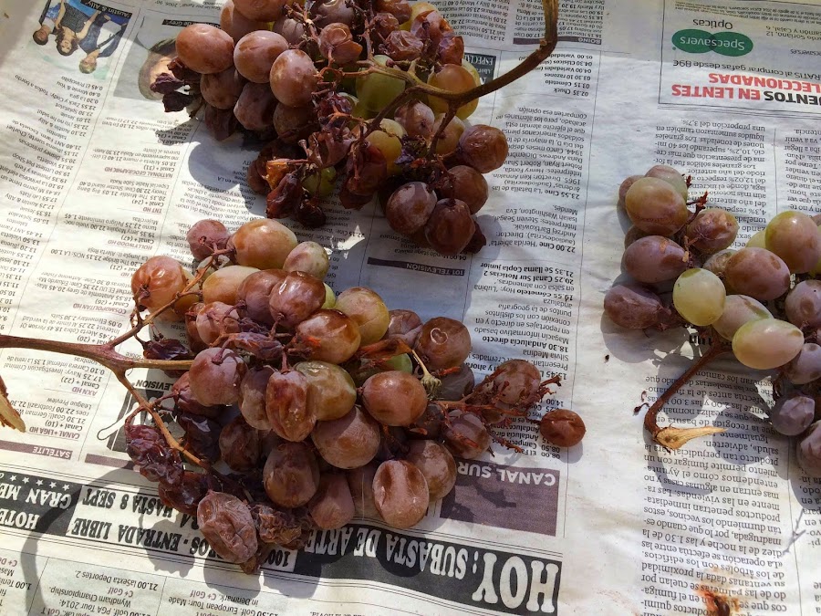 Cuando veamos que la parte expuesta al sol del racimo toma ya el color característico oscuro de las pasas, le damos la vuelta y dejamos que se seque la otra parte. Según cómo sea de tamaño el racimo necesitará más o menos días para terminar el proceso.