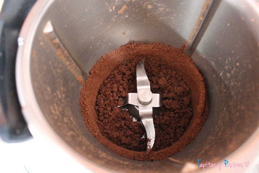 Mientras ponemos el chocolate en el vaso de la thermomix que debe estar limpio y seco y rallamos 20 segundos a velocidad 5-10.