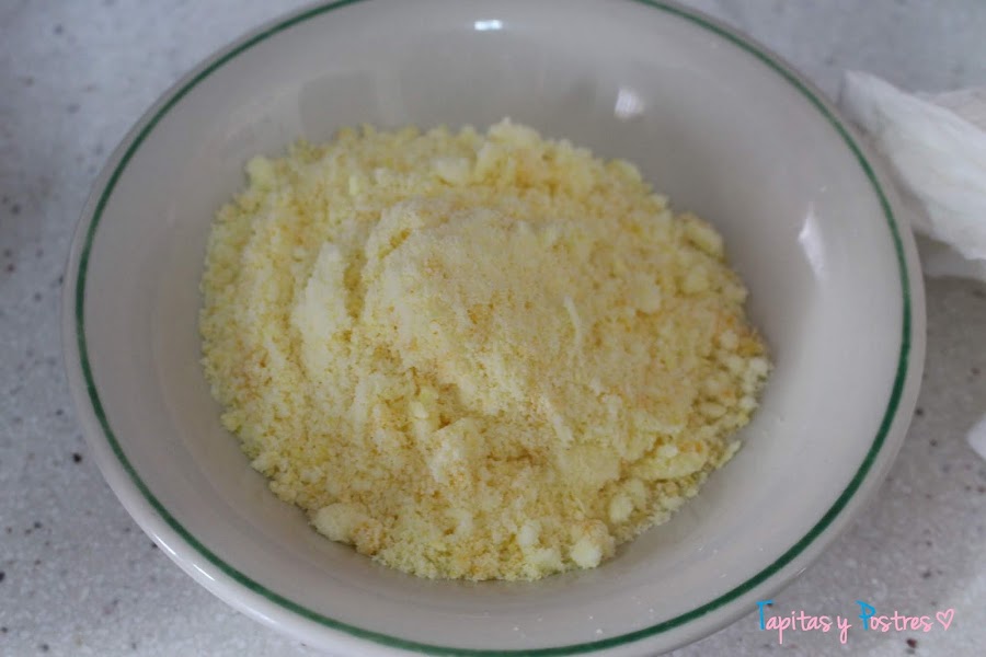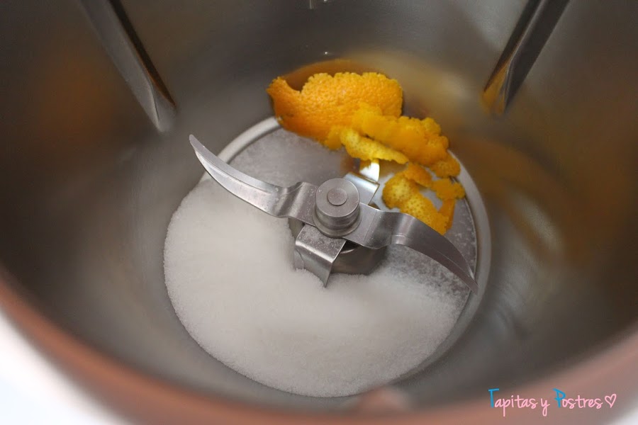 Con ayuda de una batidora o picadora trituramos el azúcar con la piel de naranja. Reservamos.