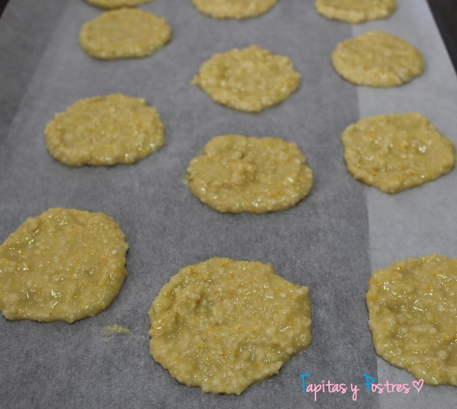 En una bandeja de horno con papel vegetal vamos poniendo porciones de masa que habremos cogido con una cucharilla. Las vamos a extender dando forma redonda de unos cinco o seis centímetros.