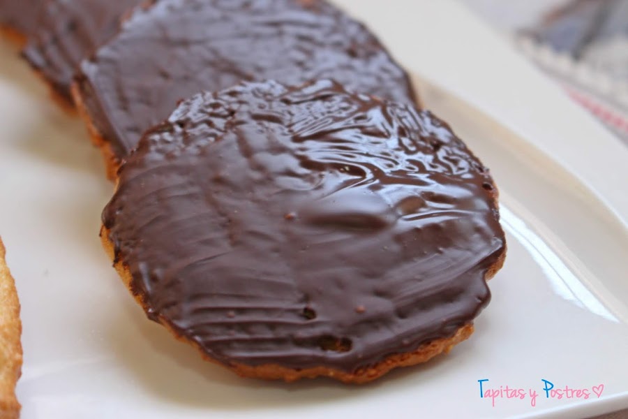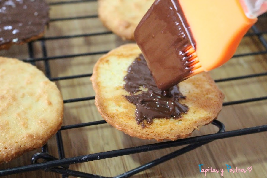 Vamos a pintar con una brocha las vallobinas con chocolate fundido. Lo haremos por la parte lisa de la galleta, o sea, la que estaba en contacto con la bandeja. Podemos pintarlas todas, o la mitad o dejarlas tal cual.