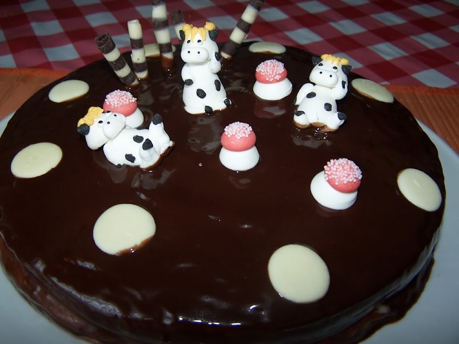 TARTA VACA, para mi hermana. Le flipan las vacas, tiene reloj, zapatillas de casa, cojines... así que una tarta no podía faltar jajajajaja