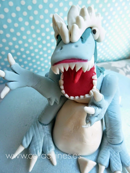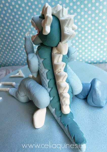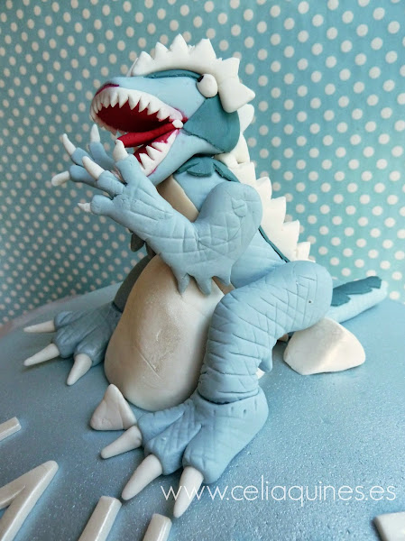 TARTA DINOFROZ para Jaume. He de decir que es la tarta que más me ha costado hacer, todo "gracias" al bicho, que pesó al final nada menos que 600g. Dicho así me da la risa porque suena al final de un parto, pero es que tanto por las horas empleadas, como por el dolor de espalda que se quedó y la satisfacción de contemplar a la criatura "al nacer", fue bastante similar :))