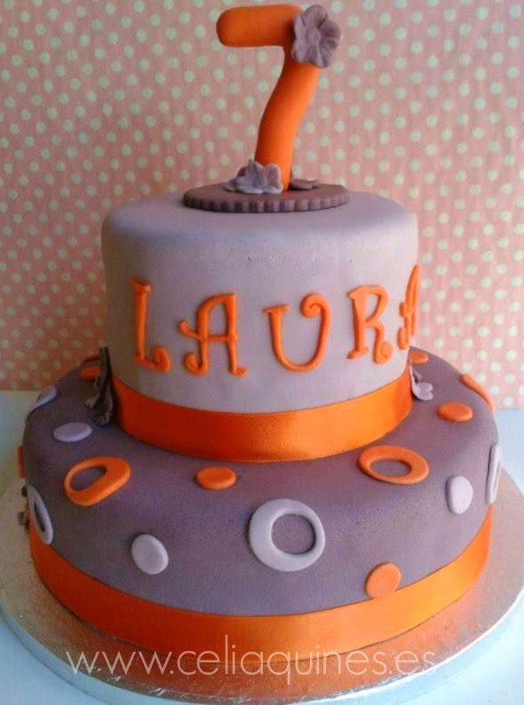 TARTA LILA para Laura. Aunque no conozco a la niña personalmente, su madre me dio unas cuantas pistas que me ayudaron a diseñar y elaborar la tarta. Laura odiaba el rosa pero le encantaba el lila, así que no había más que hablar. Su nombre y unas notas musicales naranjas en la parte de atrás de la tarta terminaron de darle el toque personal, aunque no las fotografié por falta de tiempo (hasta tuve que irme a dar el curso del CdT sin comer...-cosas que pasan-).