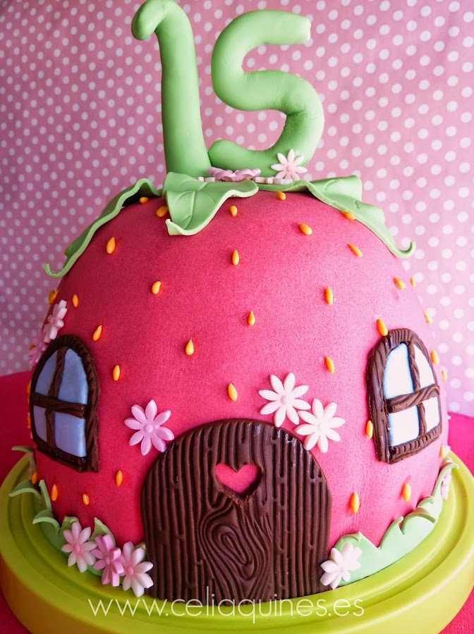 TARTA FANTASÍA para Lucía. Inspirada en una de Megasilvita hice esta tarta que imitaba ser una tarta como las que vemos en los dibujos animados, con su cobertura de fresa chorreante decorada con fresitas y caramelos. Fui testigo de cuánto le gustó a la cumpleañera y a sus amigas. :)