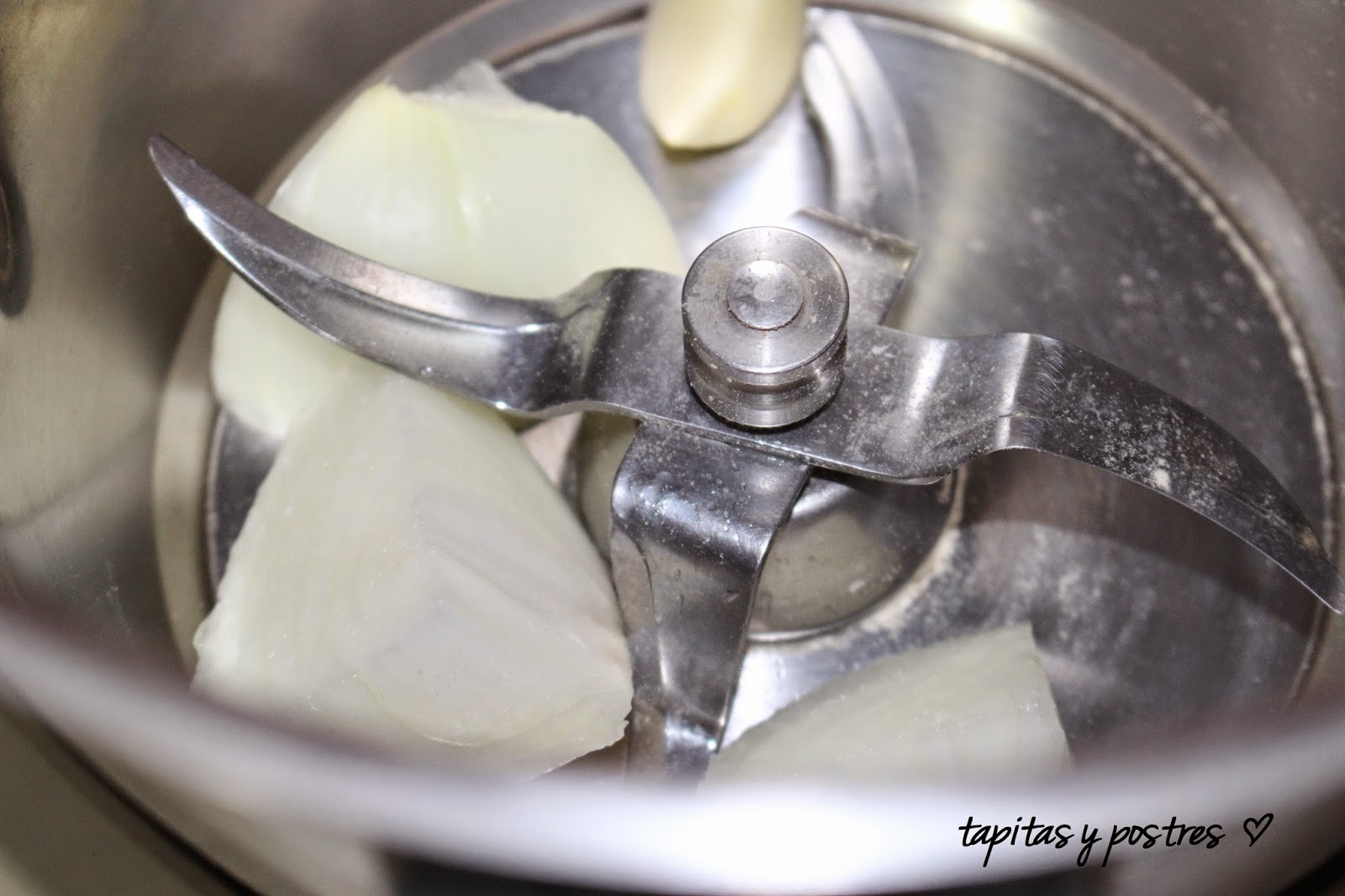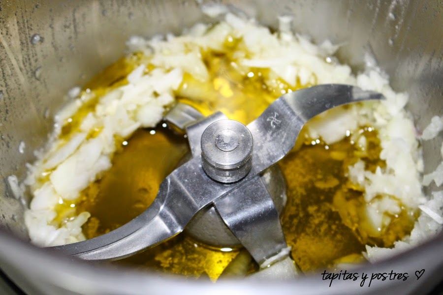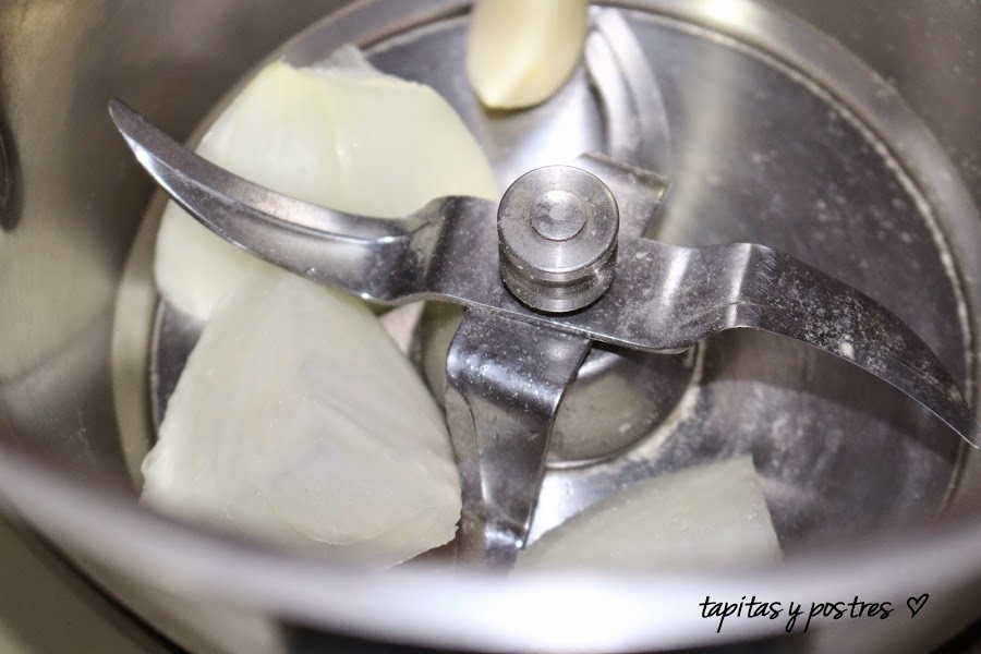 Ponemos el ajo y la cebolla en el vaso y lo picamos 5 segundos a velocidad 6.