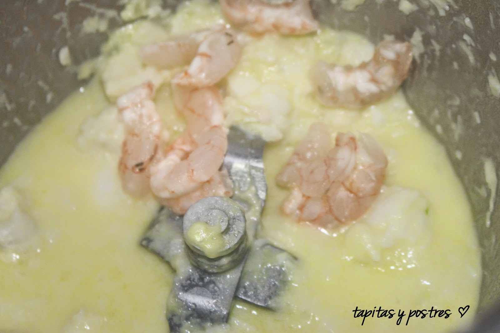 Añadimos la rosada en trozos y programamos 5 minutos a 100º, velocidad 2. cuando falten dos minutos para acabar agregamos las gambitas peladas y dejamos que la maquina acabe.
