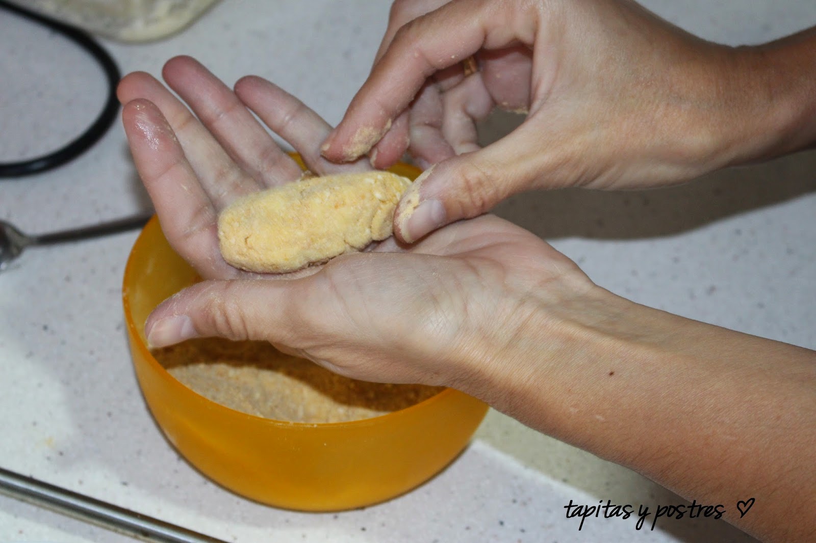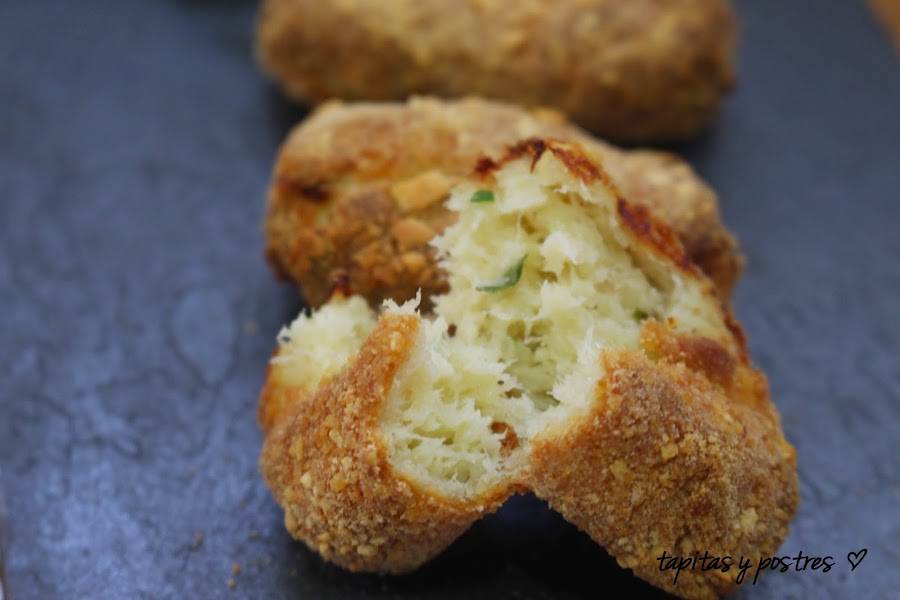 Cogemos porciones con una cuchara y pasamos por el pan rallado, el huevo batid y otra vez pan rallado. Freímos en freidora o en sartén en abundante aceite caliente.