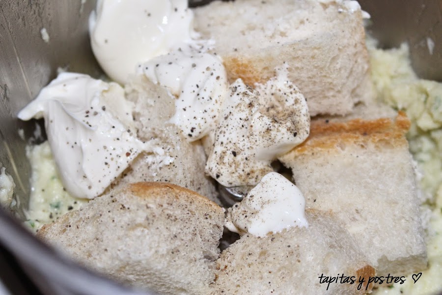 Añadimos el perejil, el pan, el queso y la sal y la pimienta al gusto. Trituramos 10 segundos a velocidad 8. Vertemos la mezcla en un bol y dejamos enfriar una hora.