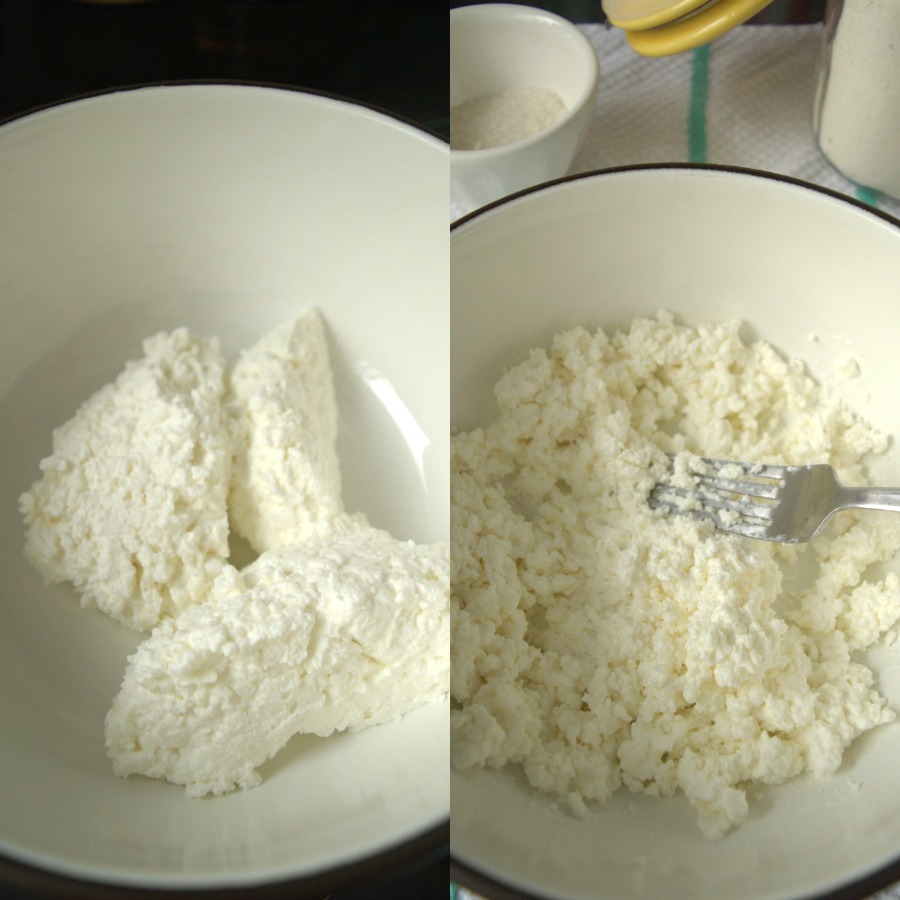 In a bowl, mash curd cheese with the help of a fork so it is a bit creamy.