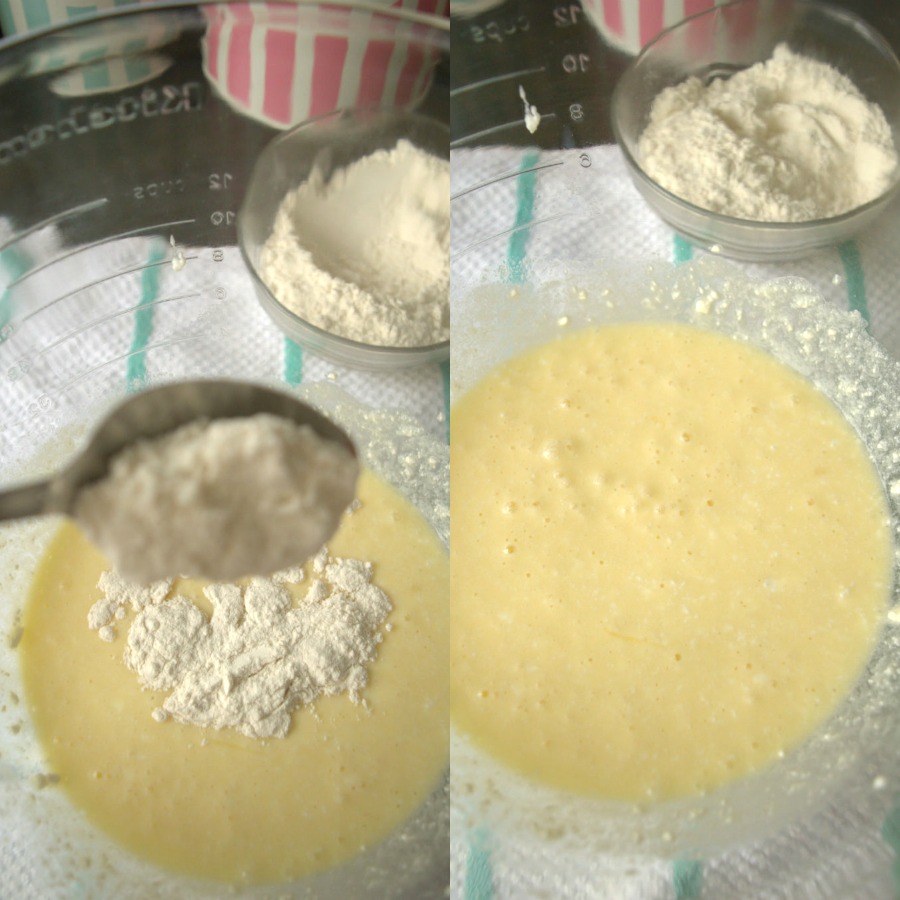 Mezclamos la harina con la levadura y la vamos añadiendo poco a poco mientras removemos con una cuchara de metal.