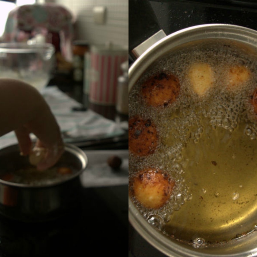 Try not to add too much balls while frying. They need space to swim in the frying pan.