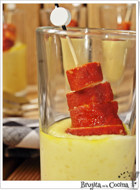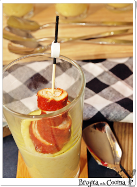 Para el montaje en un vasito ponemos una base del puré, y con una brocheta pinchamos 4-5 rodajas del pollo que pondremos, rociamos con un chorrito de aceite y listo.