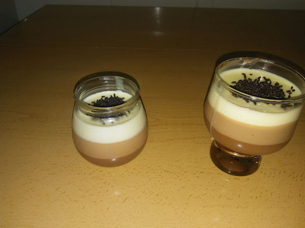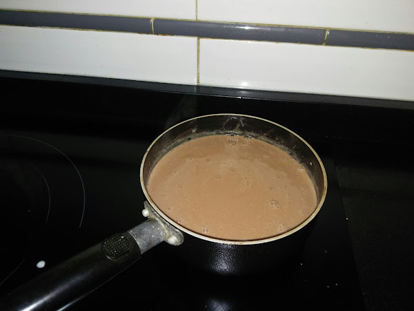 Ponemos en un cazo 200 gramos de leche, 250 gramos de nata (crema de leche) y 50 gramos de azúcar, calentamos hasta que empiece a hervir, retiramos del fuego y deshacemos los 150 gramos de chocolate negro. Una vez disuelto el chocolate añadimos la leche con la cuajada y volvemos a poner a fuego lento removiendo con varillas hasta que vuelva a empezar a hervir, durante 4 minutos. Repartir la mezcla poniendo un centímetro más o menos en los vasitos.