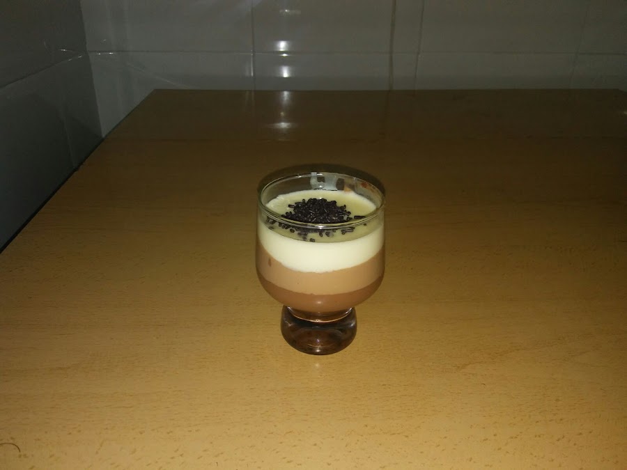 Para hacer la crema de chocolate con leche hacemos lo mismo. Separamos en un vaso 50 gramos de leche y disolvemos un sobre de cuajada. Reservamos. Ponemos en un cazo 200 gramos de leche y 250 gramos de nata (crema de leche), calentamos hasta que empiece a hervir, retiramos del fuego y deshacemos los 150 gramos de chocolate con leche. Una vez disuelto el chocolate, añadimos la leche con la cuajada y volvemos a poner a fuego lento removiendo con unas varillas hasta que vuelva a empezar a hervir, durante 4 minutos. Vertemos la mezcla sobre la crema de chocolate negro, poniendo una cuchara para que caiga con suavidad y no estropee la capa anterior. Aseguraos antes de echarla que la primera capa ya está sólida.