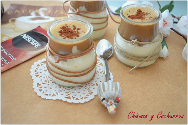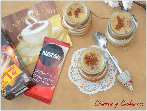 Preparar los vasos y poner 3/4 partes de nata (crema de leche) y el resto de capuchino. Guardar en el frigo hasta que cuaje. A la hora de servir poner por encima un poco de chocolate en polvo.