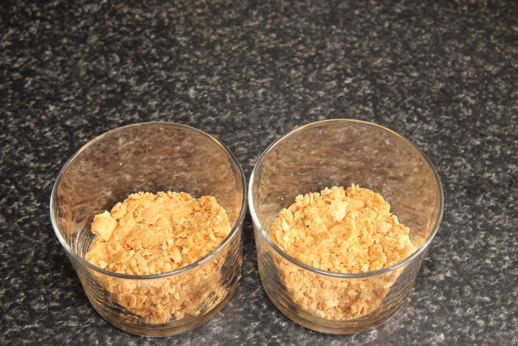 Trituramos las galletas, no es necesario que queden deshechas (yo lo he hecho en un mortero). Añadimos el zumo de naranja, no todo, tienen que mojarse pero quedar con textura arenosa. Las vamos disponiendo en el fondo de los vasitos, apretando un poco y reservamos.
