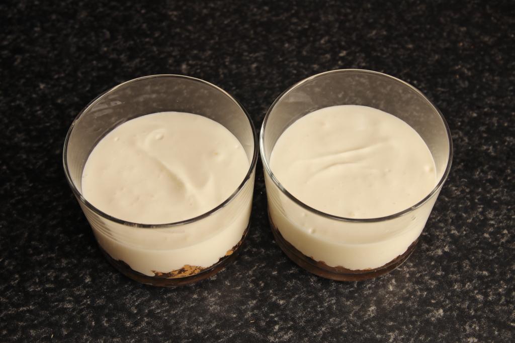 En un bol amplio echamos los yogures, el queso y el azúcar, mezclamos bien con varillas eléctricas hasta que nos quede una crema tipo cheesecake. Ponemos la cantidad deseada sobre la base de galleta sin llegar al borde de los vasos, damos unos golpecitos sobre la encimera con los vasos para quitar las burbujas. Reservamos.