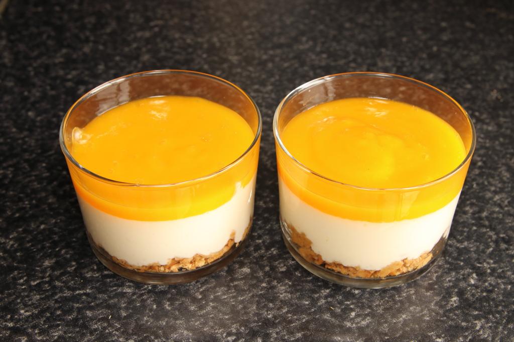 En un vaso batidor echamos el mango limpio, trituramos con la batidora y vertemos sobre la crema del relleno, volvemos a golpear en la encimera. Tapamos los vasitos con film transparente y llevamos a la nevera como mínimo 2 horas.