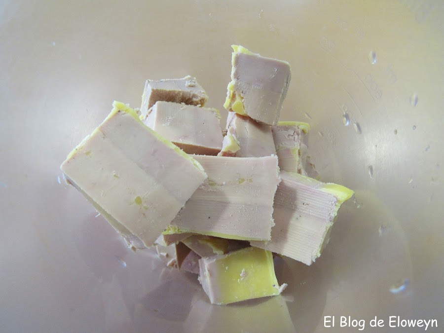 A continuación seguimos con la crema de foie. Partimos los 200 gramos de foie micuit en dados y los ponemos en el vaso de la batidora.