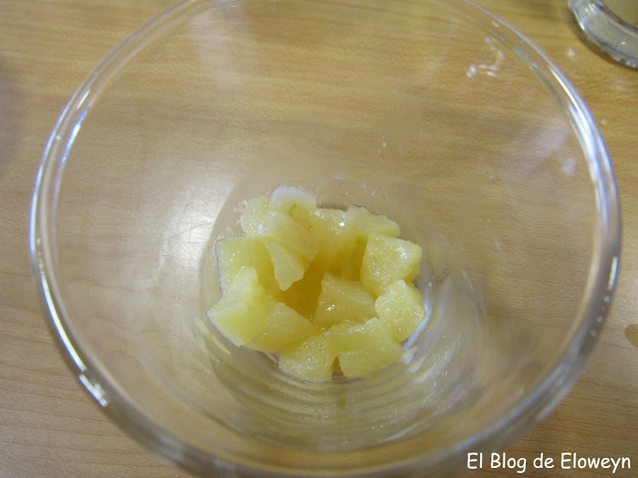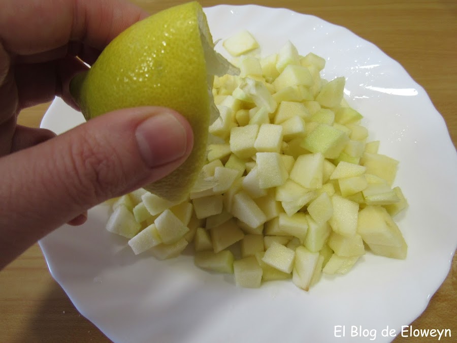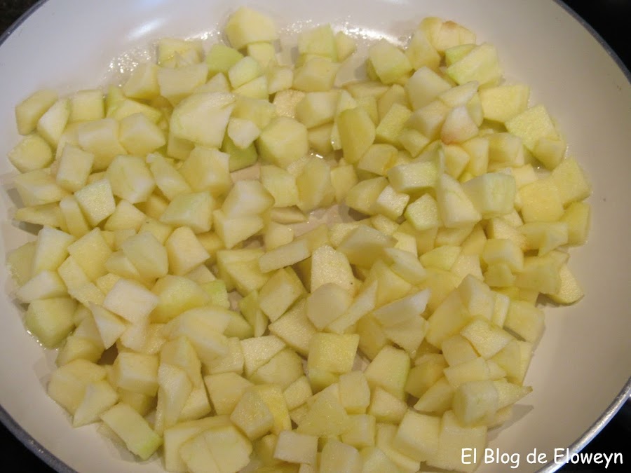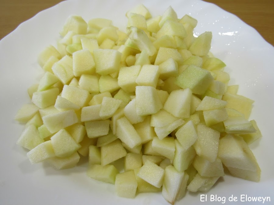 Preparación:Comenzamos preparando las manzanas. Partimos los 275 gramos de manzana en daditos pequeños.