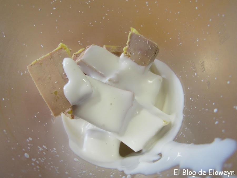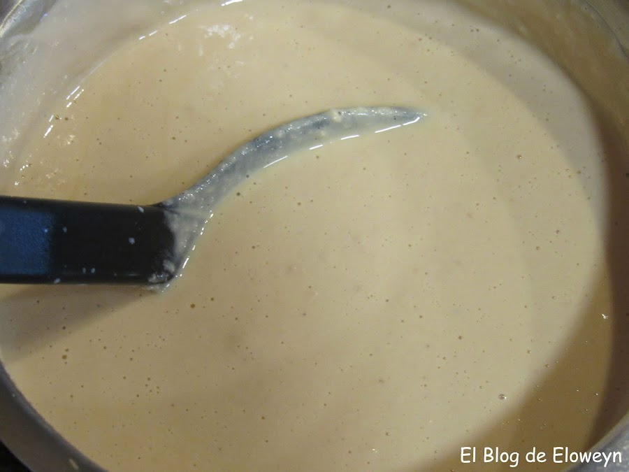 Para quienes no sepan qué es calentar al baño María, podéis ver en la foto superior que el cazo con la mezcla se ha de poner dentro de otro cazo más grande. Este cazo más grande ha de tener agua hirviendo. Mientras se va calentando la mezcla, se ha de ir removiendo con cuidado. En un momento determinado, la mezcla espesará.