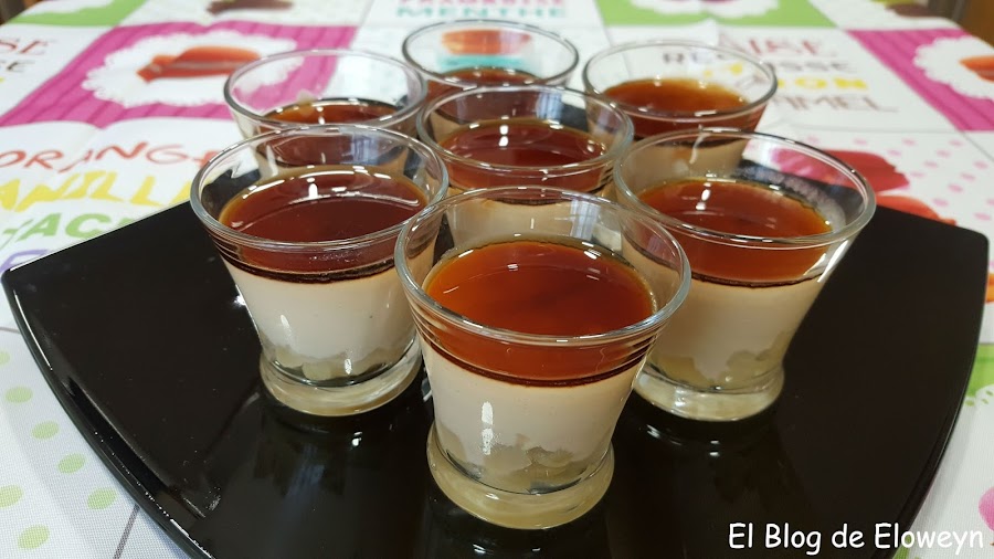 Una vez la mezcla haya espesado, la retiramos del baño María y la repartimos entre los vasitos. Dmos unos golpes con suavidad en los vasitos para que se eliminen las burbujas del interior.