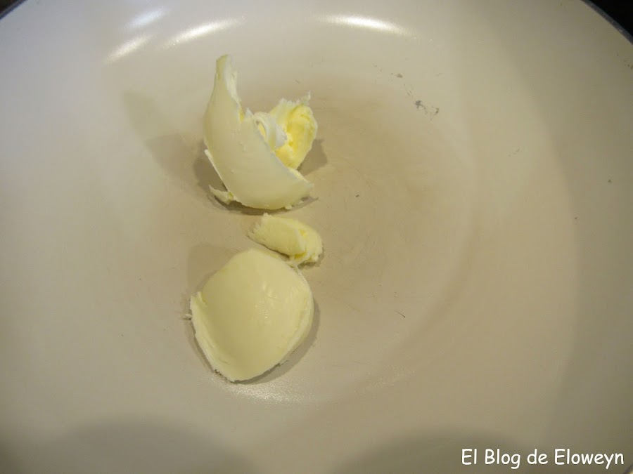 A continuación, en una sartén anti adherente, a fuego lento, derretimos los 20 gramos de mantequilla.