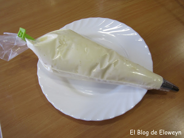 Lo mezclamos a mano, con una espátula, poco a poco para que no se baje la nata (crema de leche) y con movimientos envolventes. Una vez esté bien mezclado, lo ponemos en una manga pastelera con una boquilla de estrella abierta. Cuanto más abierta, mejor, ya que si os queda granulado y la boquilla no es muy abierta podéis tener problemas.