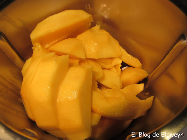 Pelamos los mangos y los cortamos en trozos. Los ponemos en el recipiente donde los vayamos a triturar y reservamos.