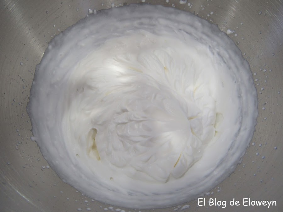Podéis montar la nata (crema de leche) manualmente (es una faena... jajaja), o con un robot de cocina. Yo usé una Kitchenaid, que va fenomenal para estas cosas. Para que la nata (crema de leche) monte bien debe estar bien fría. Hay gente que incluso pone el recipiente donde la va a montar en la nevera. En mi caso no puse el recipiente en la nevera, el bol de la Kitchenaid es enorme, y no cabía de ninguna forma... jajaja.