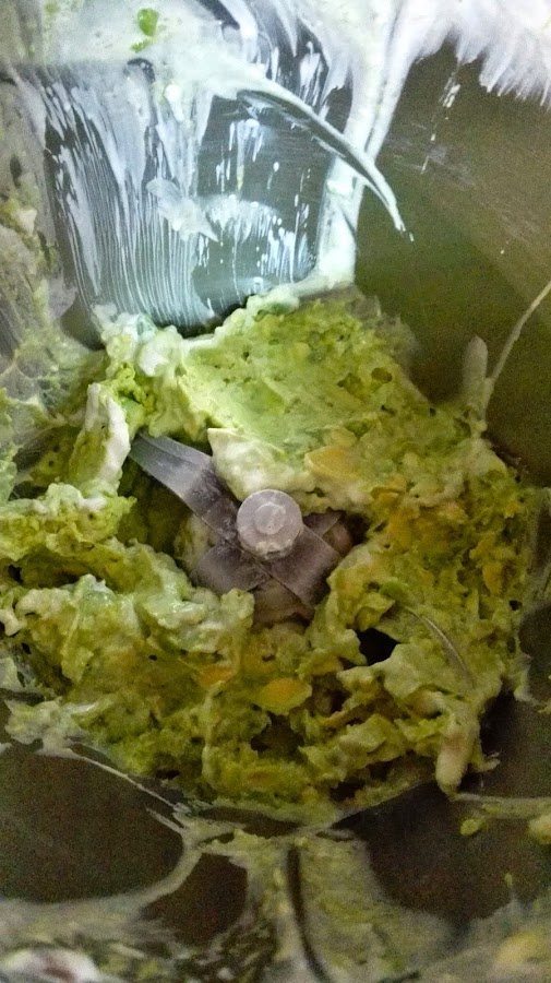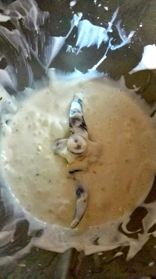Agregamos el queso, la nata (crema de leche), el cebollino y la pimienta, 5 segundos/ velocidad 3, sino, vamos mezclando hasta que se espese un poco.