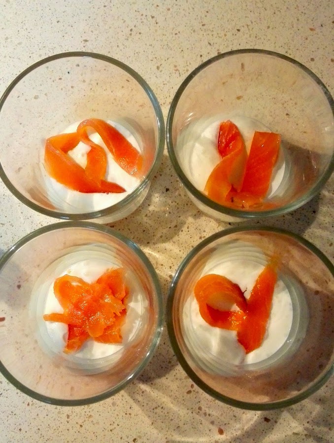 Ponemos encima de nuestra mezcla las tiritas de salmón y reservamos.