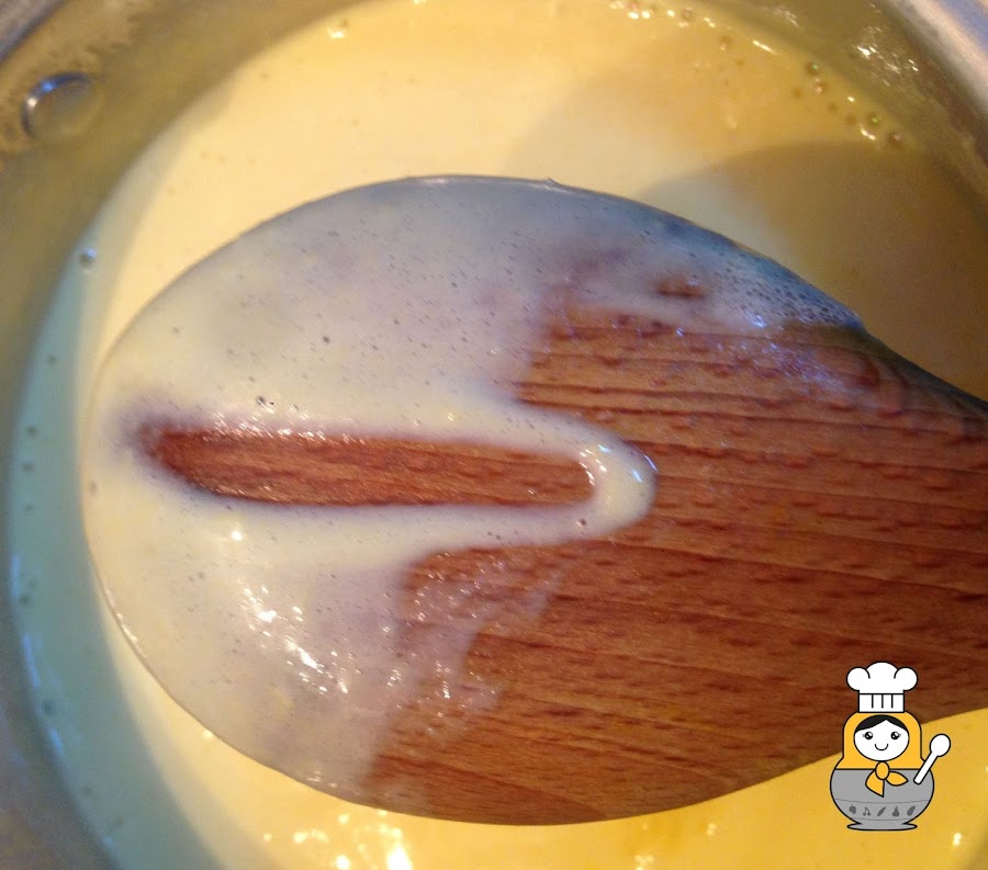 En otro recipiente, batimos las yemas de huevo junto con la otra mitad del azúcar con ayuda de las varillas eléctricas hasta conseguir que queden espumosas. Incorporamos a las yemas la mitad de la mezcla de leche y nata (crema de leche) que hemos hervido y removemos muy fuerte. Vertemos el contenido del bol en el cazo, removemos y volvemos a llevar el cazo al fuego, pero a fuego bajo (muy importante) y sin dejar de remover en ningún momento, siempre con una cuchara de madera, hasta que nape la (unos 10 minutos) y obtendremos una crema inglesa. Que nape la cuchara quiere decir lo que veis en la foto, que al pasar el dedo por el dorso de la espátula quede dibujado el trazo.