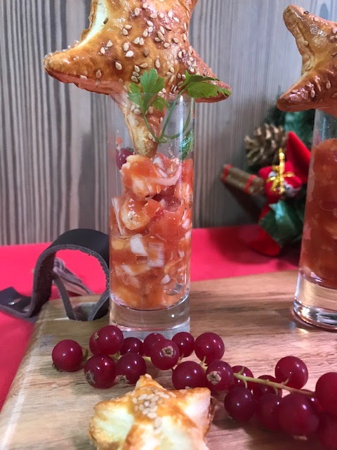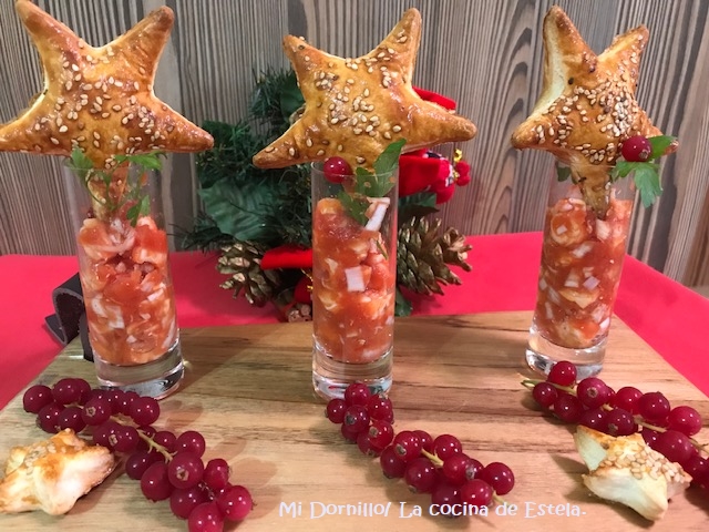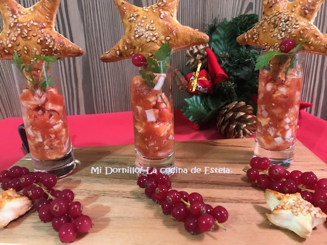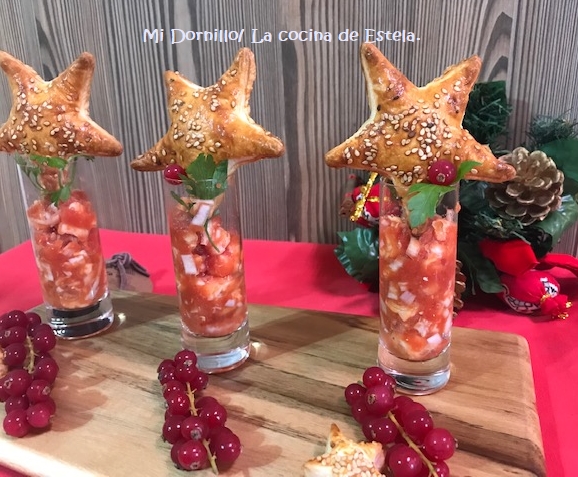 Servimos en vasitos con tostas, o en este caso lo he puesto con galletas hechas con hojaldre.